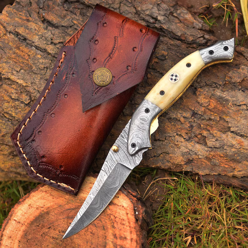 This handcrafted Damascus pocket knife features a unique bow-shaped camel bone handle and is perfect as a personalized gift for him, a custom knife for groomsmen, or a practical everyday carry for women. Whether it's a birthday, anniversary, or special occasion, this knife makes a memorable and functional gift.