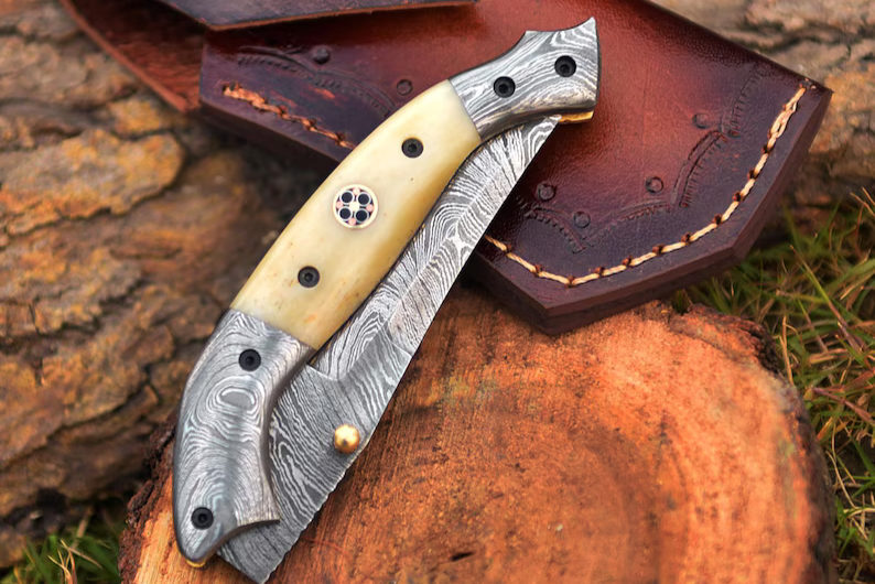 Handmade Damascus Pocket Knife with Camel Bone Handle – Personalized Folding Knife – Custom EDC Knife, Gift for Him, Groomsmen, Anniversary