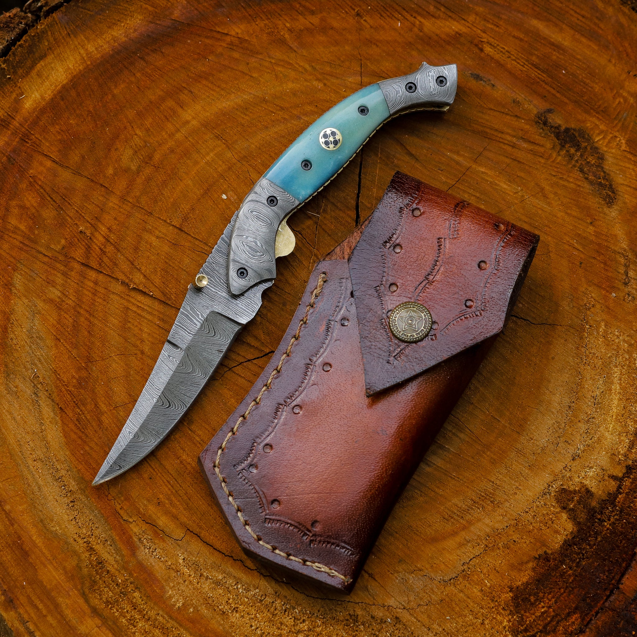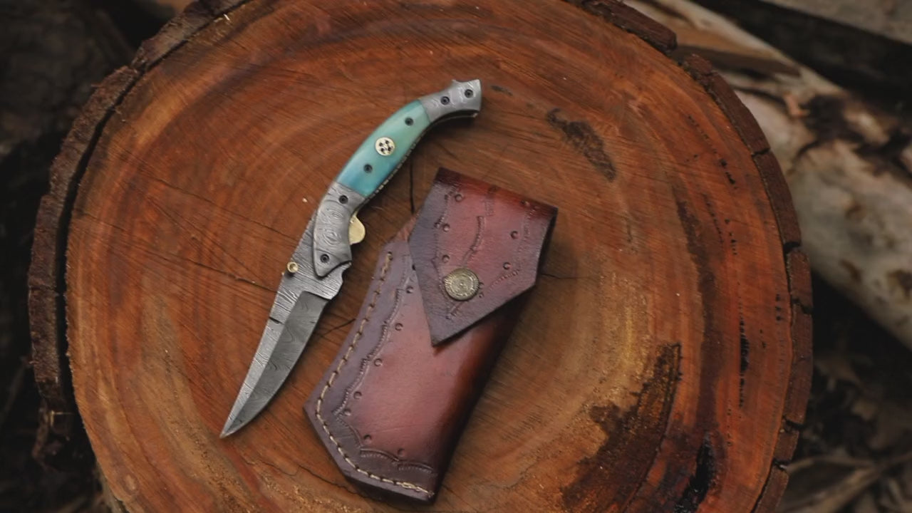 For those who are drawn to the ocean’s palette, the Tide pocket knife is a striking choice. The blue‑green camel‑bone handle evokes the sea’s ever‑changing hues, while the Damascus blade provides the performance and artistry you expect from a handcrafted tool. This knife combines natural materials, careful craftsmanship and functional design to create a pocket‑sized companion that stands out both on shore and in your hand.