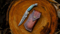 Inspired by rolling ocean swells, the Tide variant pairs our handcrafted Damascus pocket knife with a camel‑bone handle dyed in vivid blue‑green tones. Camel bone is denser than bovine bone and “colors nicely and makes a great handle material”. On this model the dye permeates the bone completely, so the color runs all the way through. Each handle is then polished to a smooth, high‑gloss finish that evokes the shimmering surface of the sea. The result captures both the energy and calm of the ocean—a pocket knife that is as beautiful as it is functional.